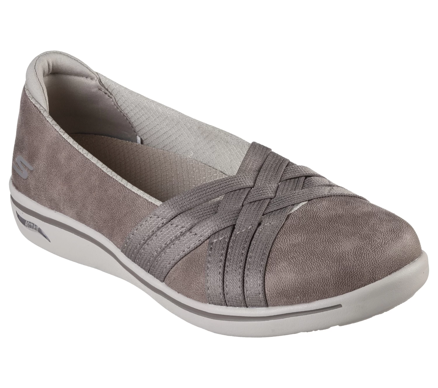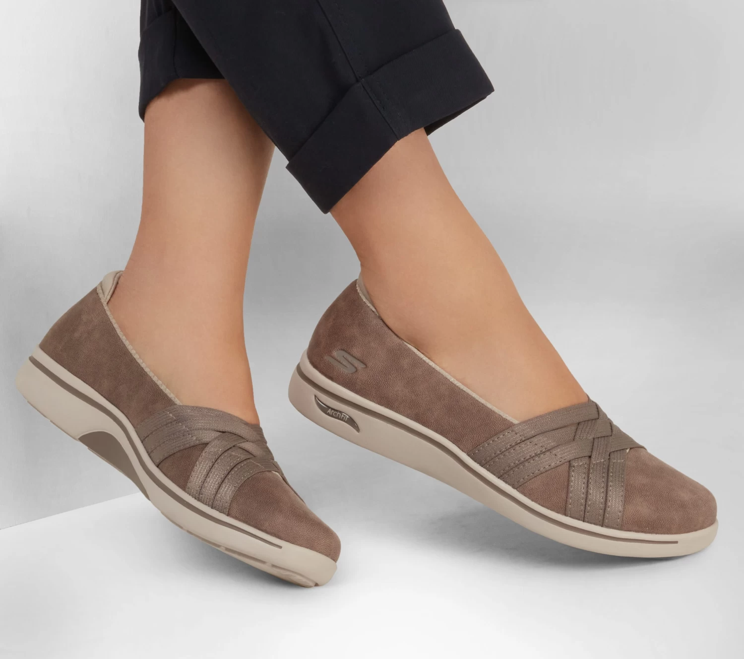 Skechers Arch Fit® Uplift: take the day in easygoing style and long-lasting comfort. This Mary Jane style pull-on features a Perform Tex smooth fabric upper with crisscross straps, removable Arch Fit® insole and a lightweight ULTRA GO® cushioned midsole.