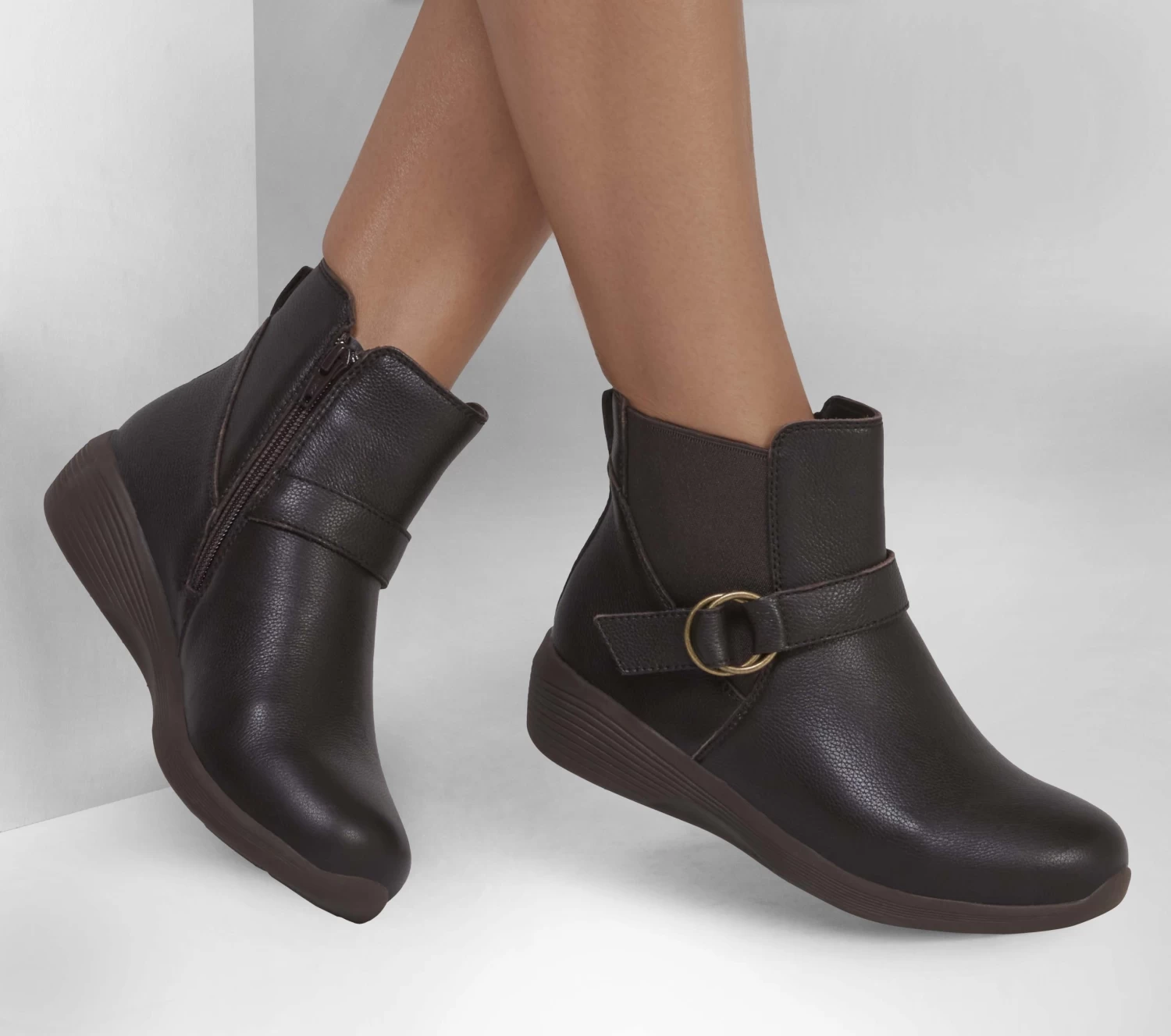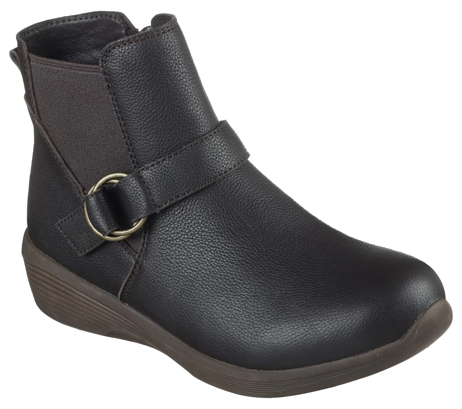 Modern style and chic sensibilities combine in Skechers Arya – Mod Squad. This casual bootie features a leather upper with an O-ring buckle detail, side zip closure and a cushioned Skechers Air-Cooled Memory Foam® comfort insole.