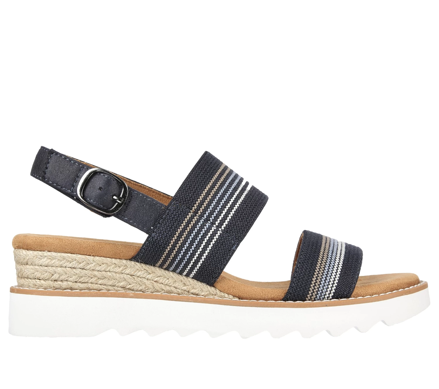 Style in breezy style and comfort with BOBS from Skechers Desert Kiss Hi – Tea Time. This strappy comfort sandal features a striped woven fabric upper with a cushioned Skechers Memory Foam footbed. For every BOBS purchase, a donation is made to animals in need.