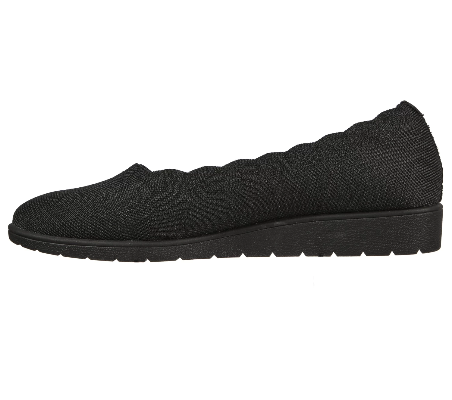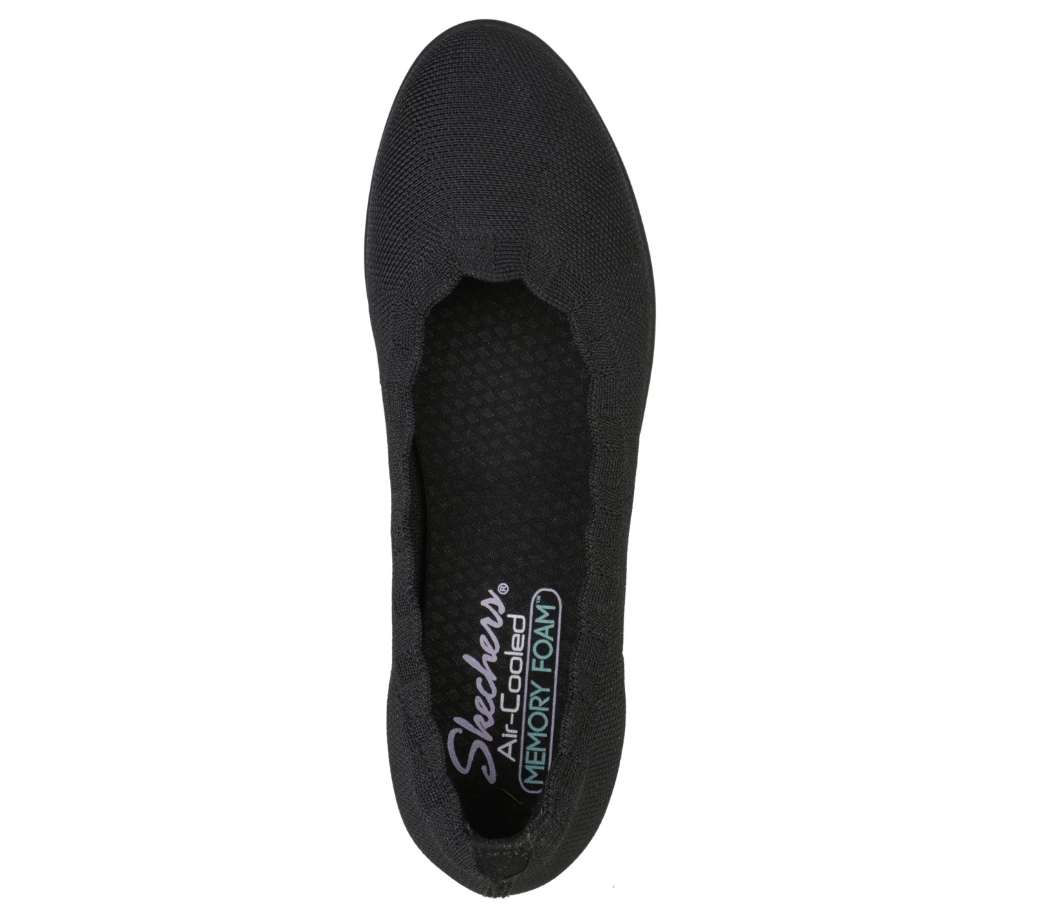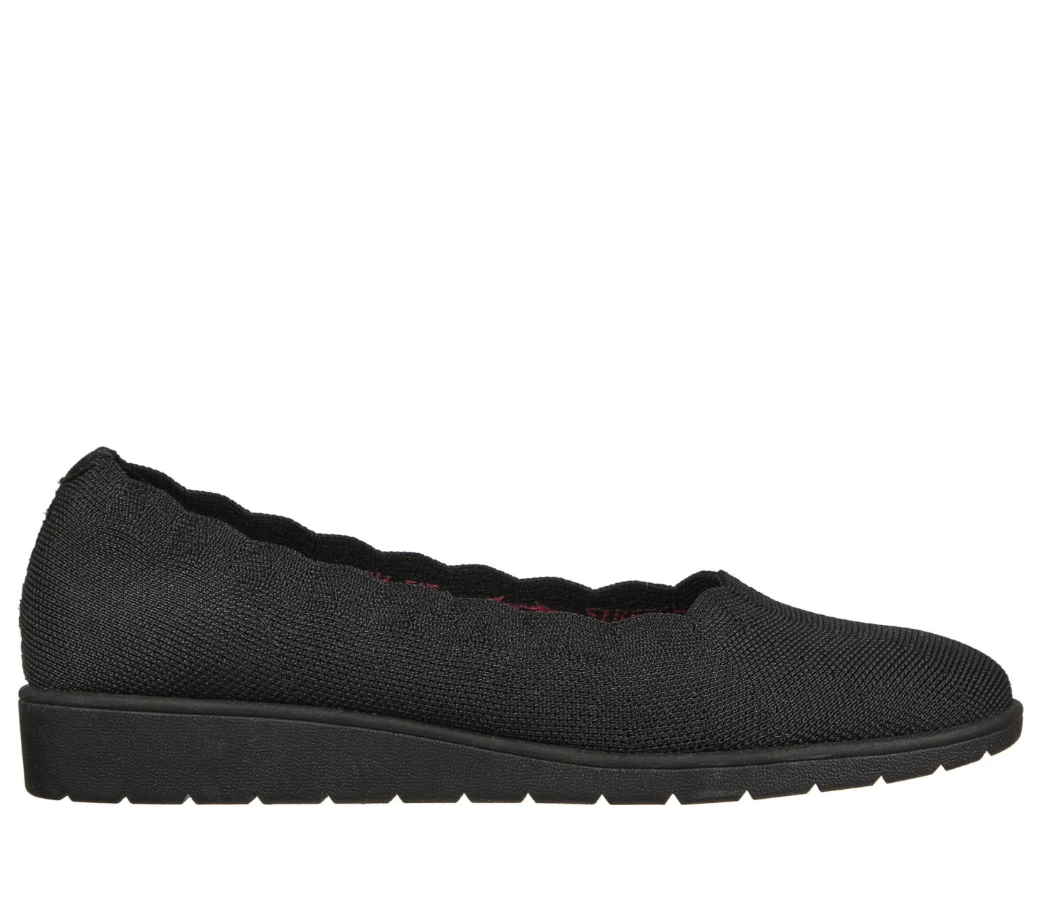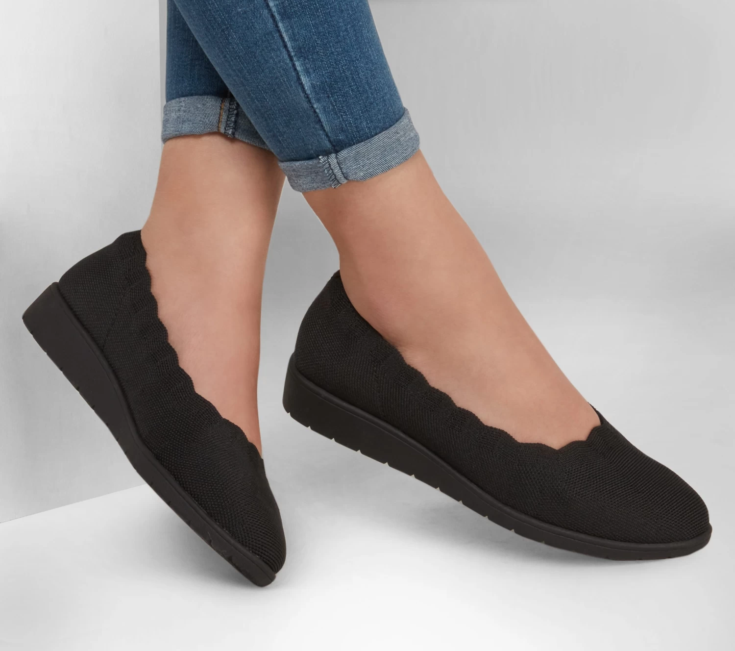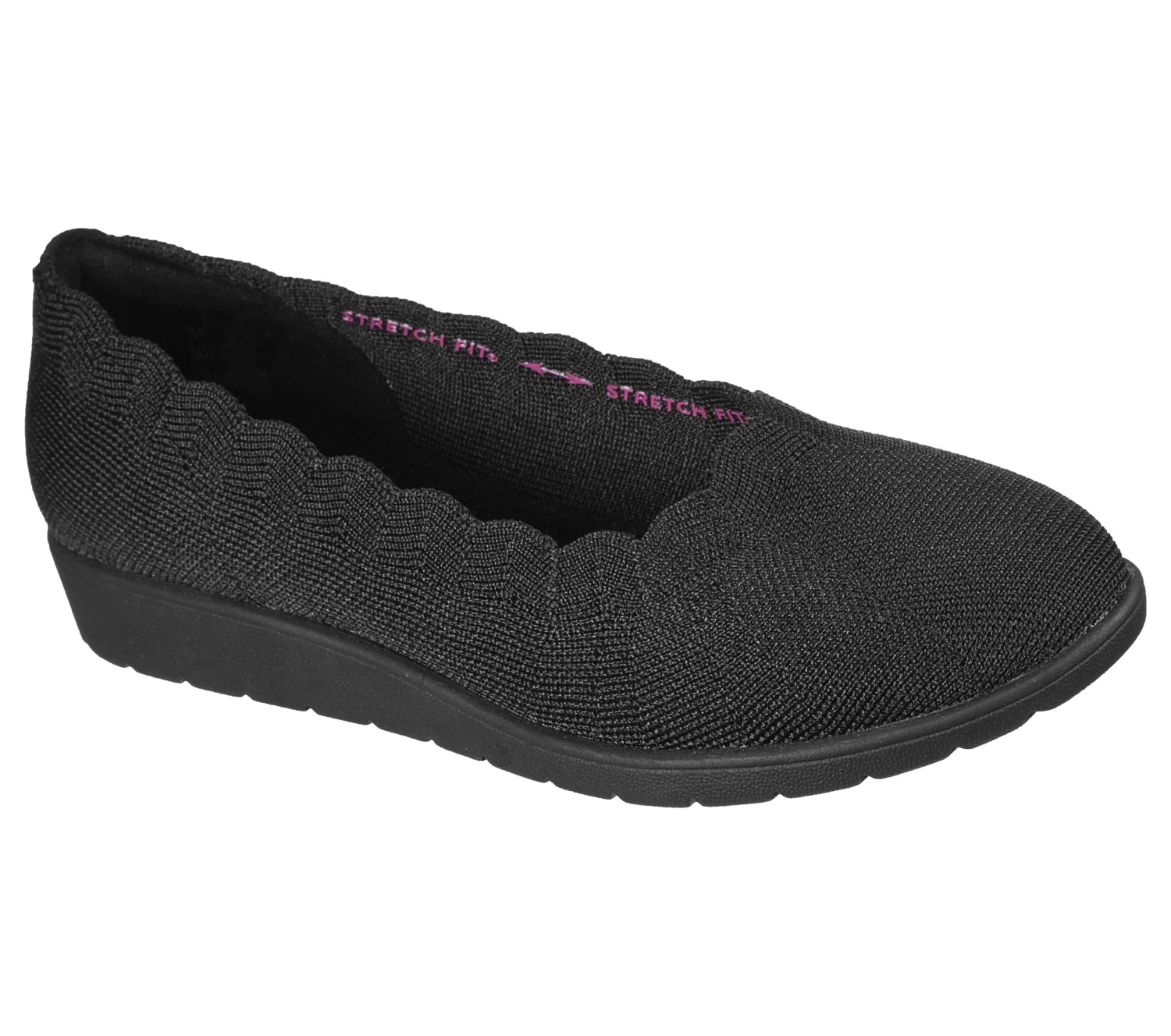 Modern style and feet-loving comfort combine in Skechers Cleo® Flex Wedge – Spellbind. This Stretch Fit® skimmer design features an engineered knit upper with a scalloped trim, cushioned Air-Cooled Memory Foam® insole and a low wedge heel.