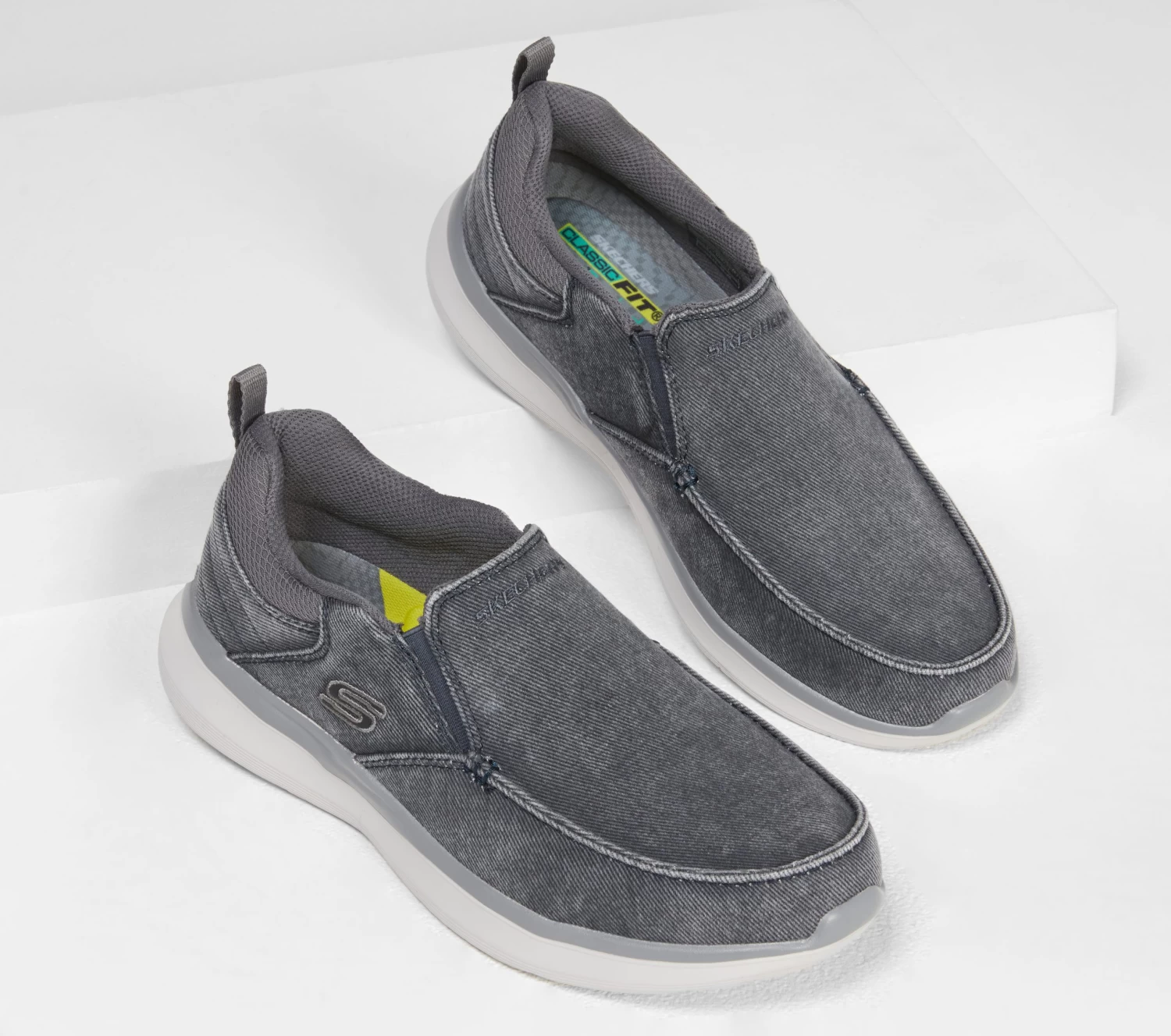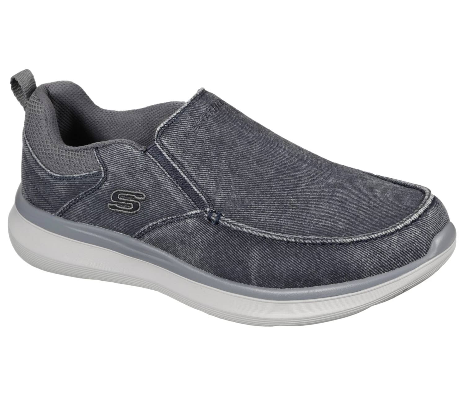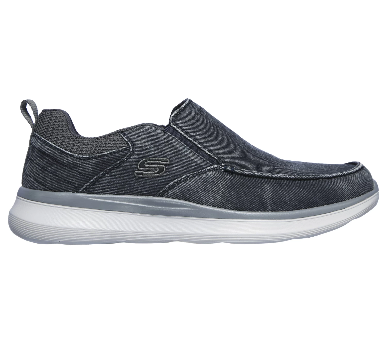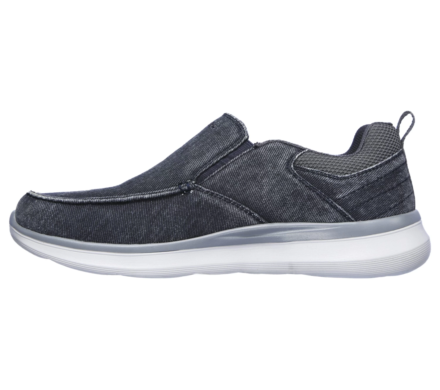 Soft comfort meets versatile, casual style in Skechers Delson 2.0 – Larwin. Vintage canvas fabric upper in a slip-on casual moc toe loafer with Air-Cooled Memory Foam insole and flexible comfort midsole.