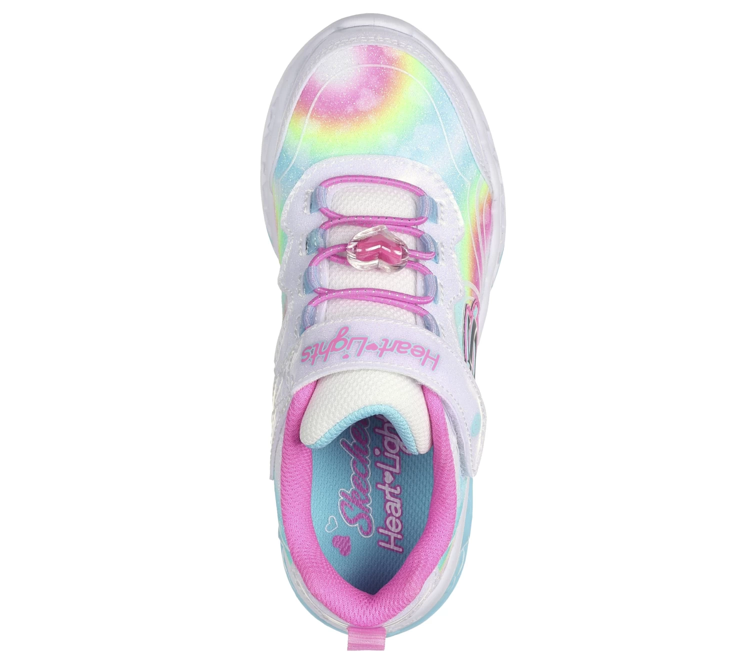 Brighten your steps with heart-filled style wearing Skechers Flutter Heart Lights® – Groovy Swirl. This lighted design features a multicolor glitter print fabric upper with synthetic glitter overlay, stretch laces with heart charm, and adjustable instep strap.