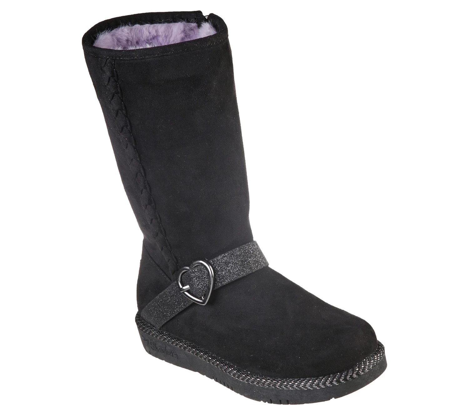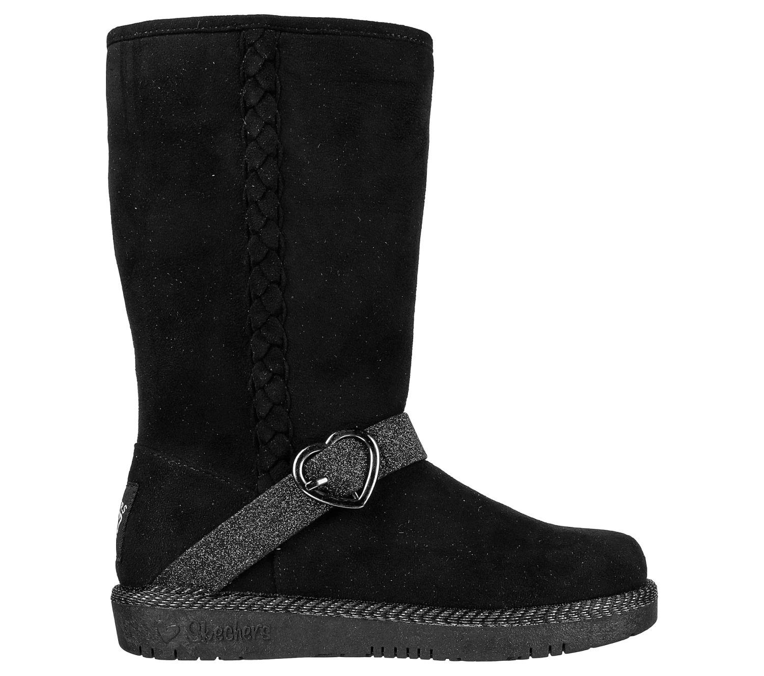 Casual tall cool-weather boot design - Braided side seam detail, glitter instep strap with heart buckle