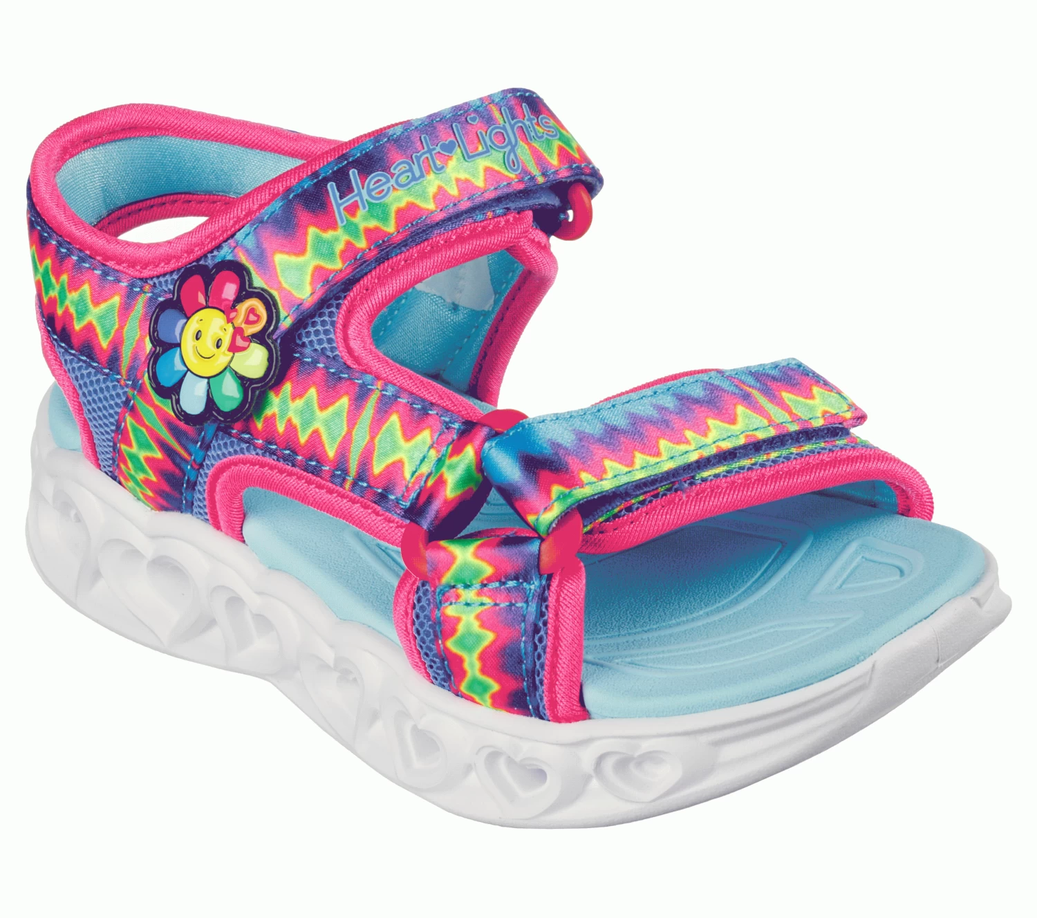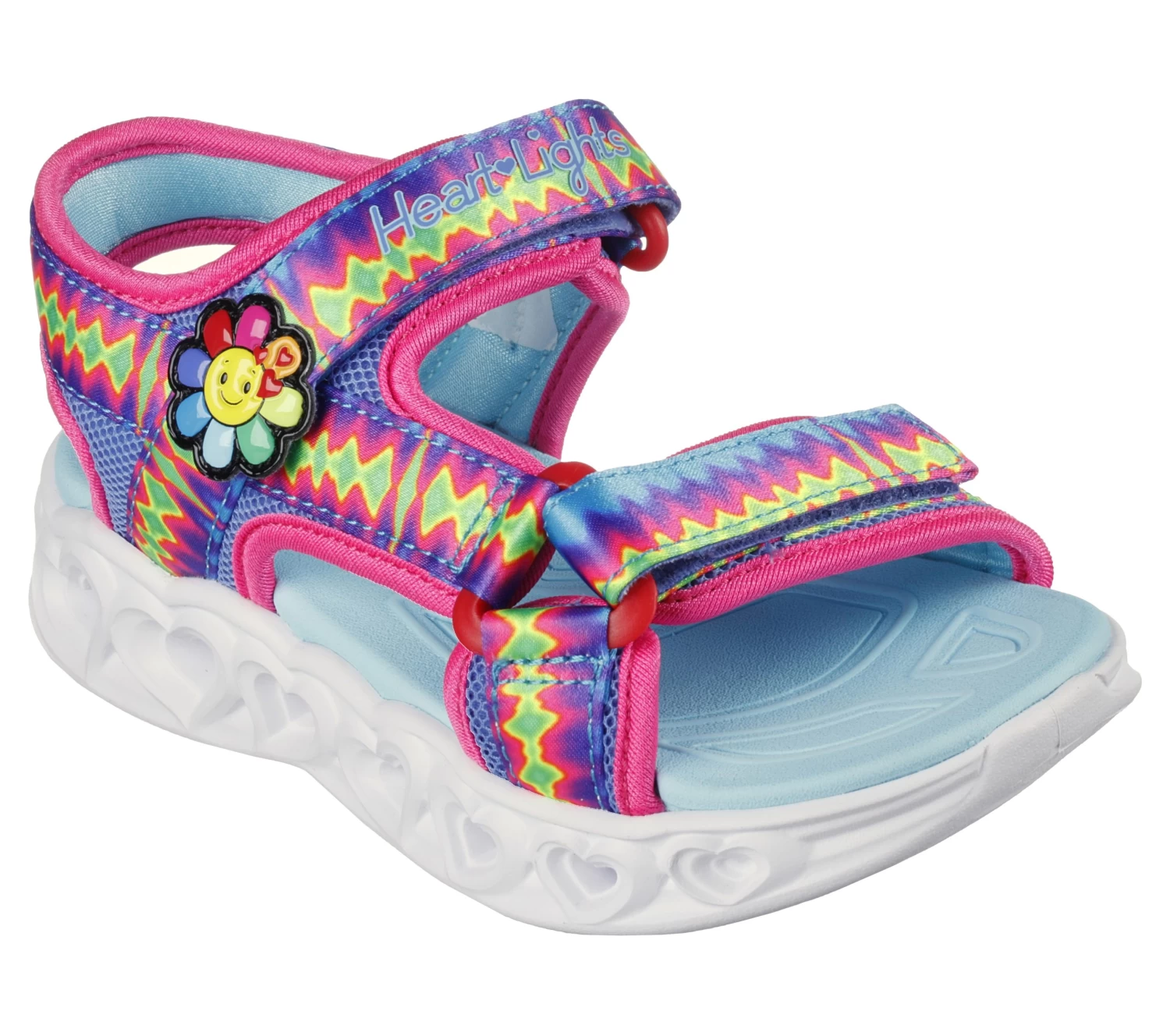 Get that groovy light bright feeling in every step wearing Skechers Heart Lights® Sandal – Miss Vibrant. This strappy sandal features a tie-dye print fabric upper with a cushioned comfort footbed and a fun 3-D heart-sculpted light-up midsole.