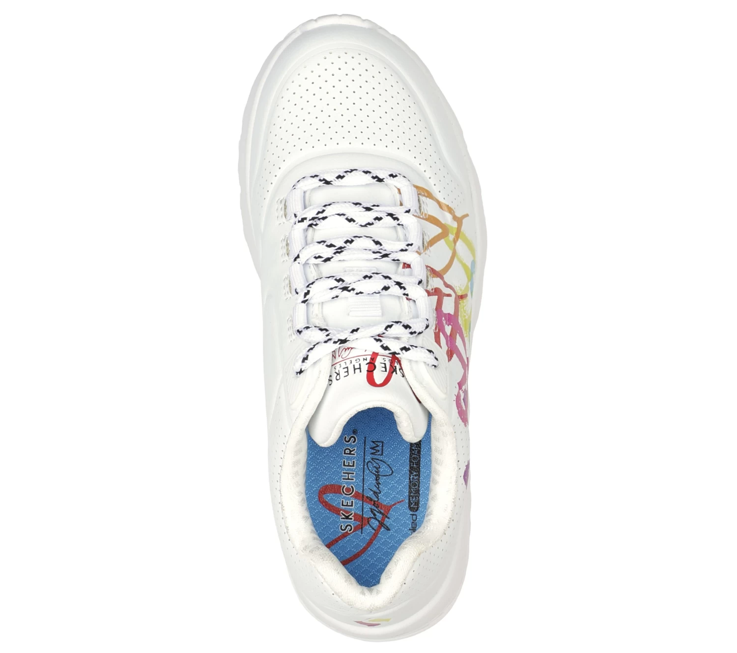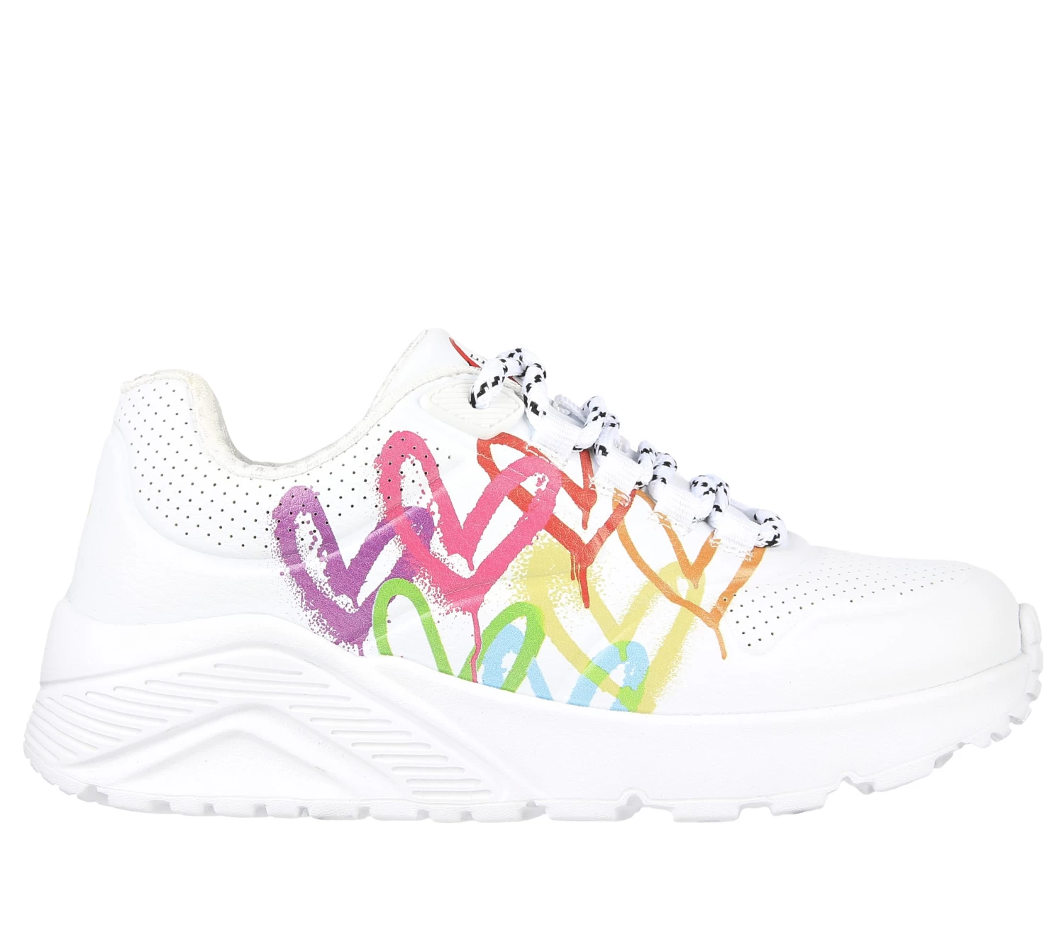 Internationally renowned muralist James Goldcrown brings his iconic #Lovewall heart designs to Skechers in this inspiring collaboration. Show your creative style with the Skechers x JGoldcrown: Skechers Street™ Uno Lite – Love Brights. This lace-up fashion sneaker features a print of the artist’s signature heart design, synthetic durabuck and perforated trimmed upper with a Skechers Air-Cooled Memory Foam® insole and a platform wedge midsole.