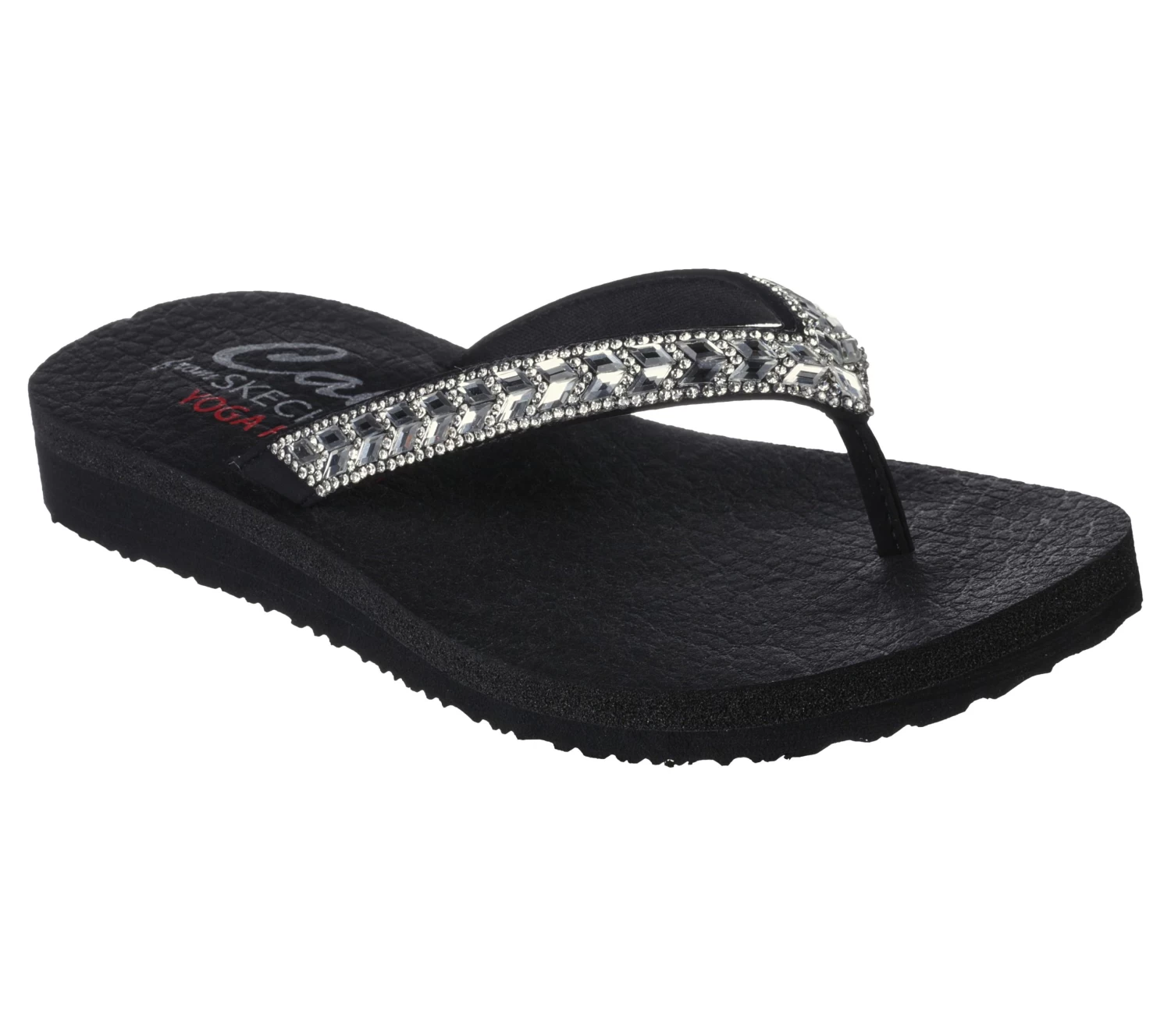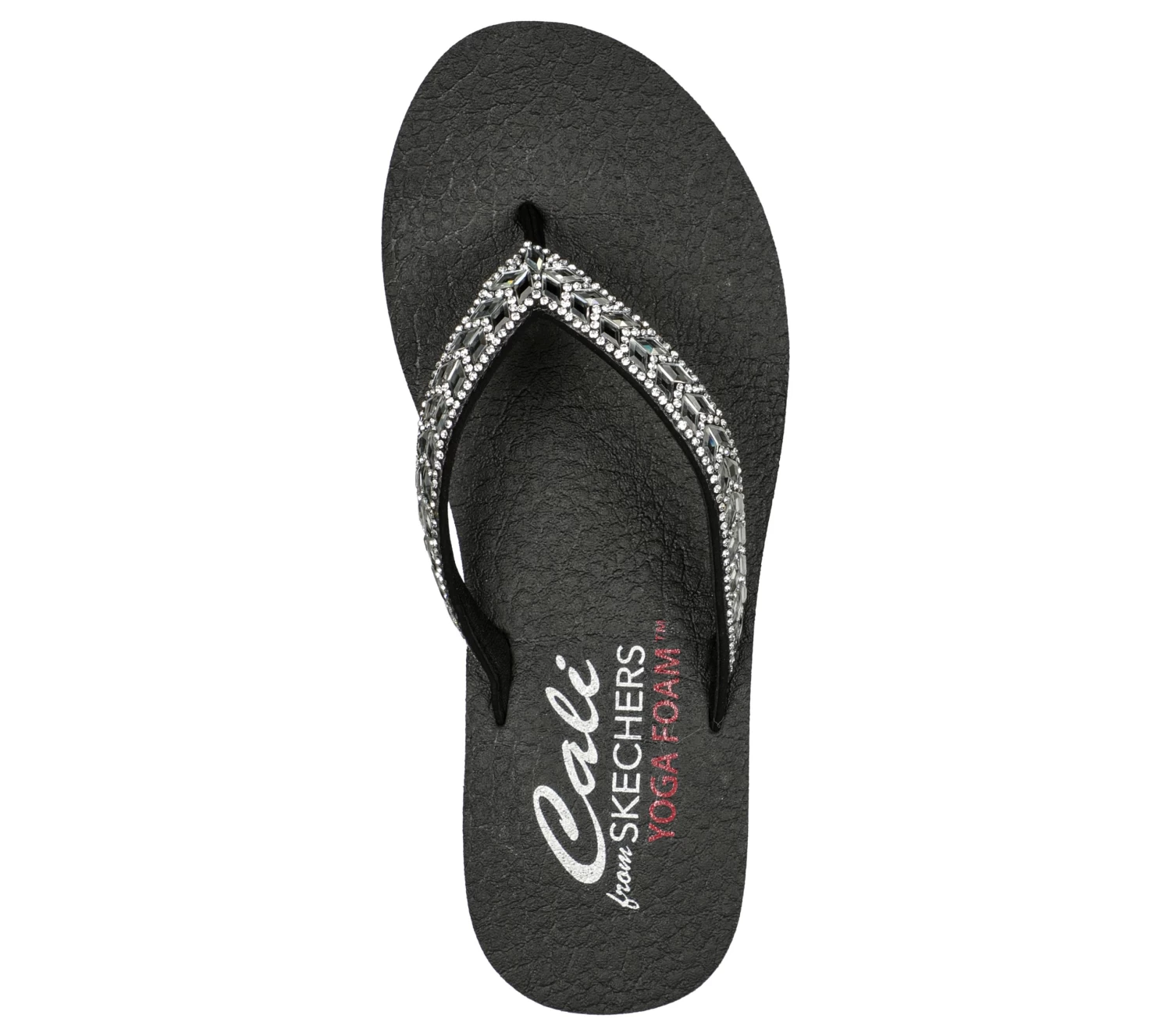 Glam up in style this season wearing Skechers Cali® Meditation – Clear Waters. This casual vegan thong sandal features a three-point synthetic upper with multi-colored rhinestone details and a cushioned Yoga Foam comfort footbed.