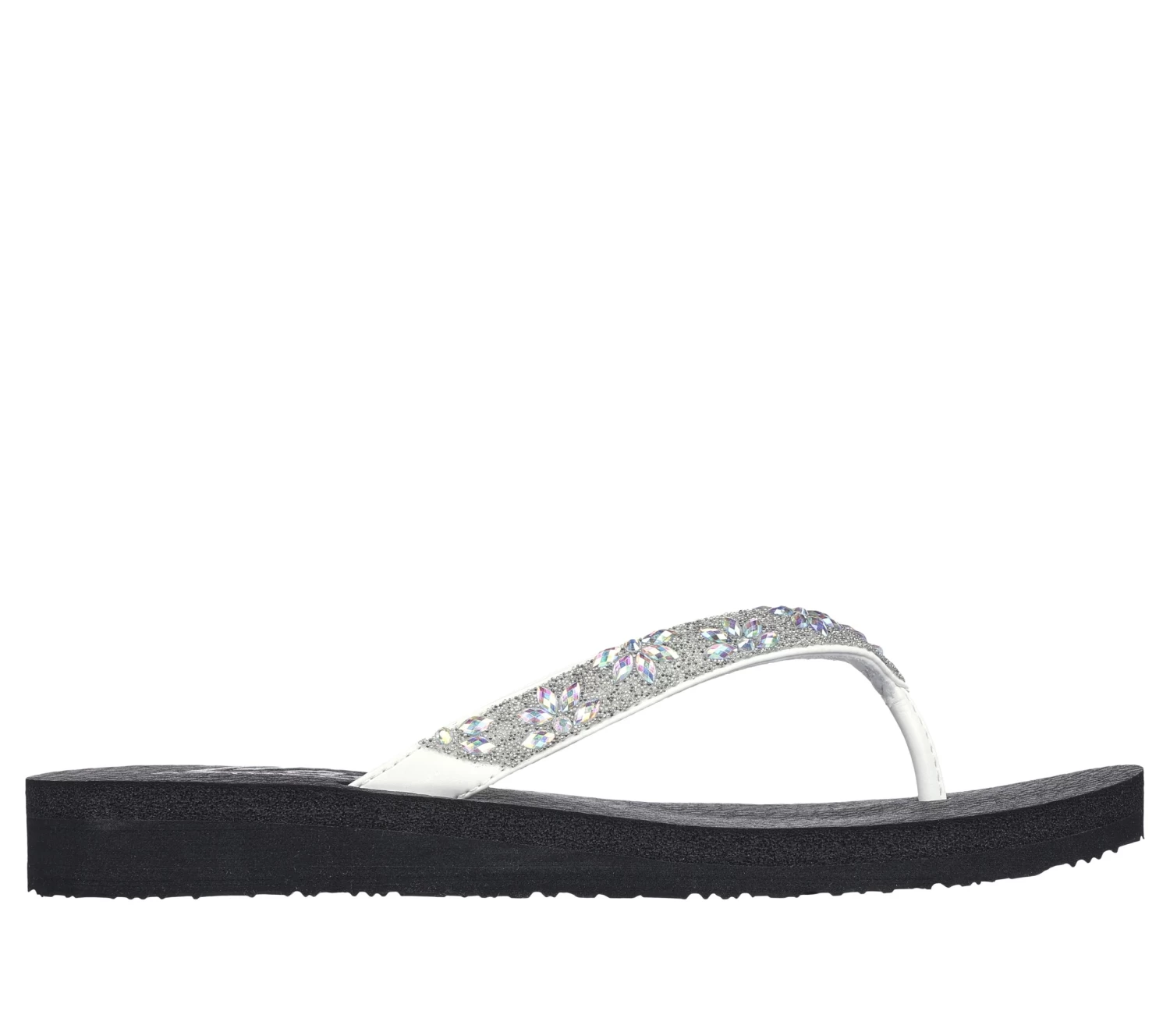 Warm weather fashion goes full bloom in Skechers Cali® Meditation – Love Letter. This vegan thong sandal features a synthetic upper with a glitter finish and floral gem detail, plus a Yoga Foam comfort footbed.