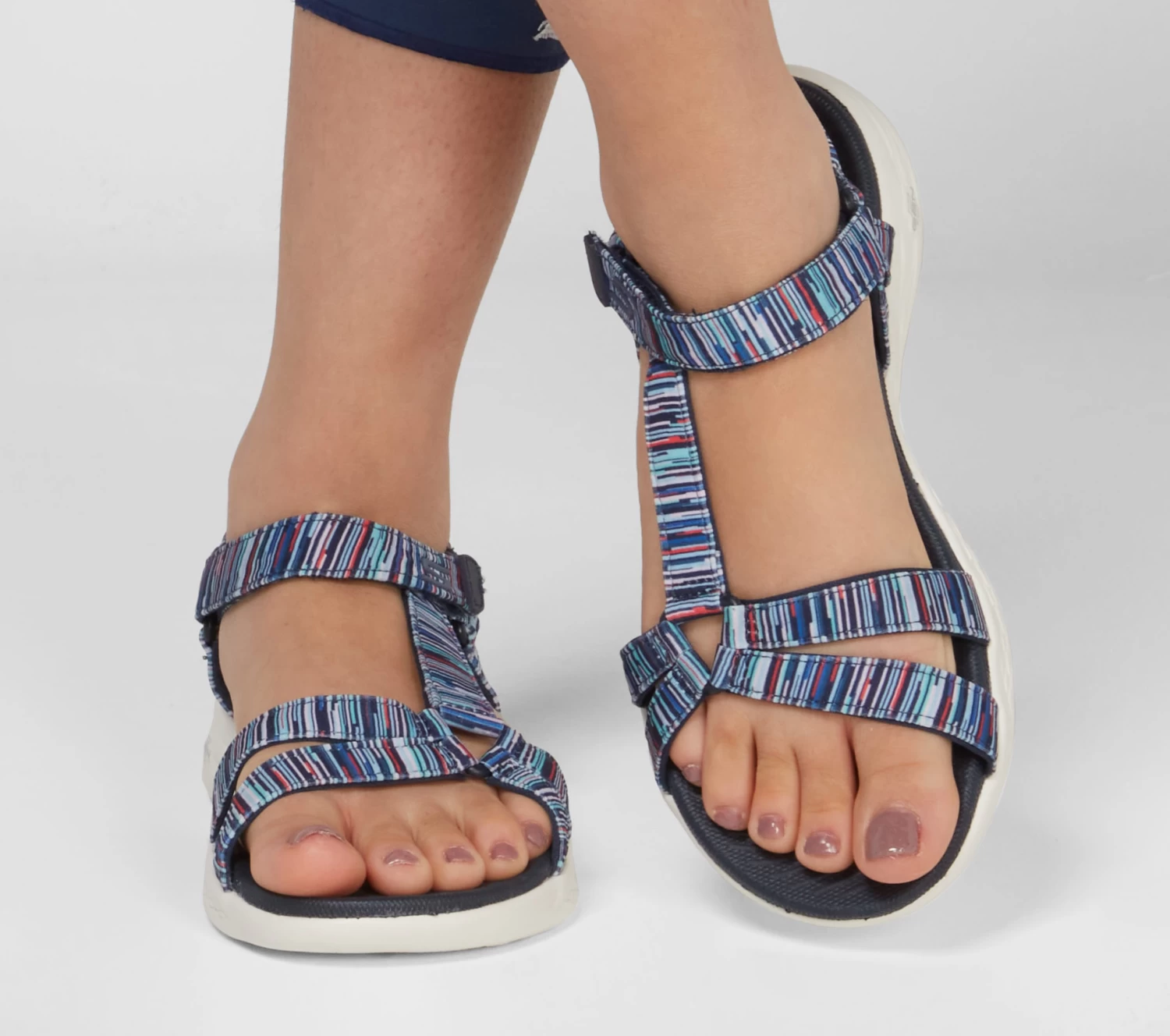 Add fun color to your next trek in Skechers On-the-GO 600 – Electric. This sporty strappy river sandal features a heathered fabric upper with lightweight 5GEN® cushioning midsole and contoured Goga Mat comfort footbed.