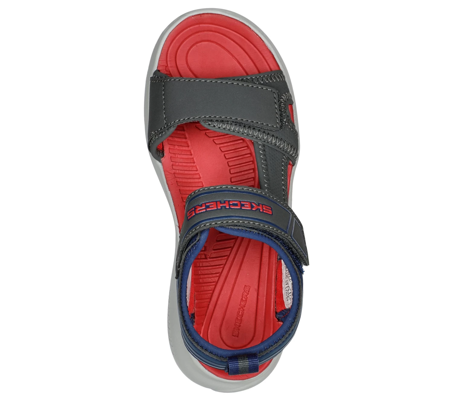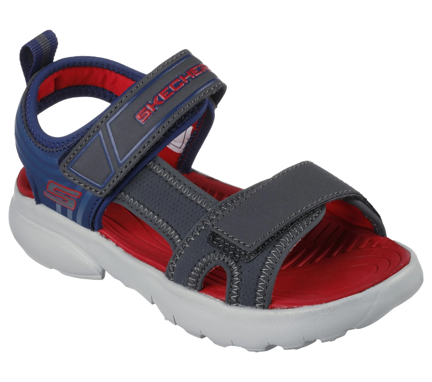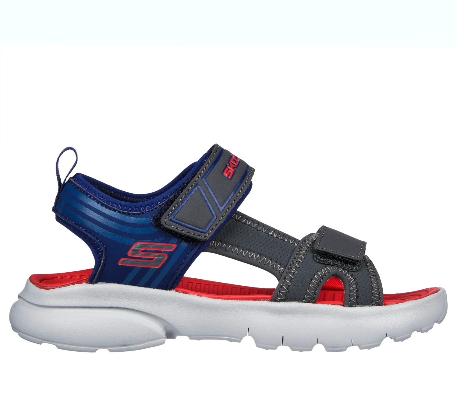 Hangout in comfort and sunny-weather style with Skechers Razor Splash. This adjustable sporty river style sandal features a smooth synthetic upper with color block details, hook and loop closures, plus a cushioned comfort insole.