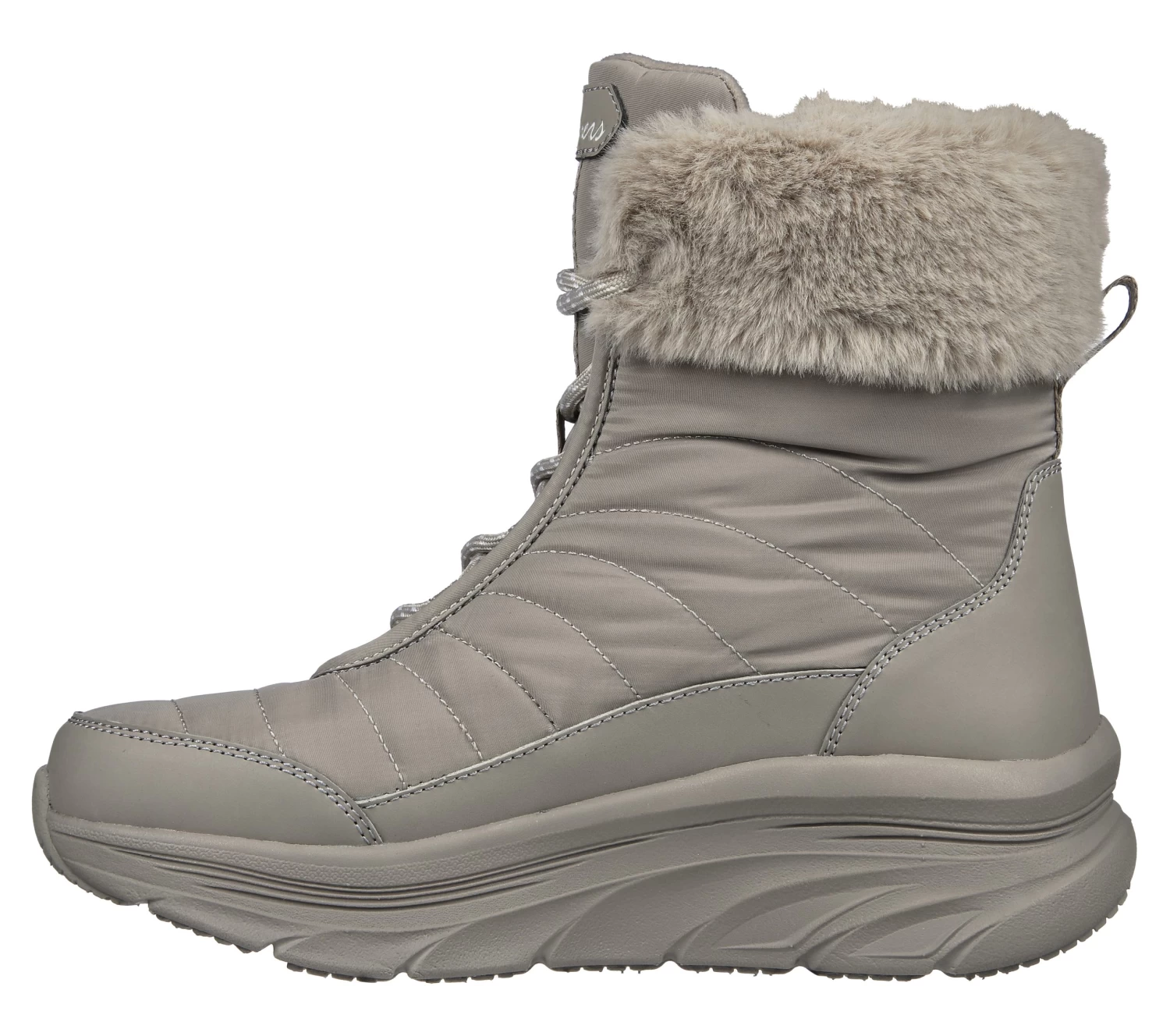 Enjoy cozier walks in supportive comfort wearing Skechers Relaxed Fit®: D’Lux Walker – Winter Solstice. This water-repellent cold-weather bootie features a lace-up woven fabric and synthetic upper, faux-fur lining and a cushioned Skechers Air-Cooled Memory Foam® insole.