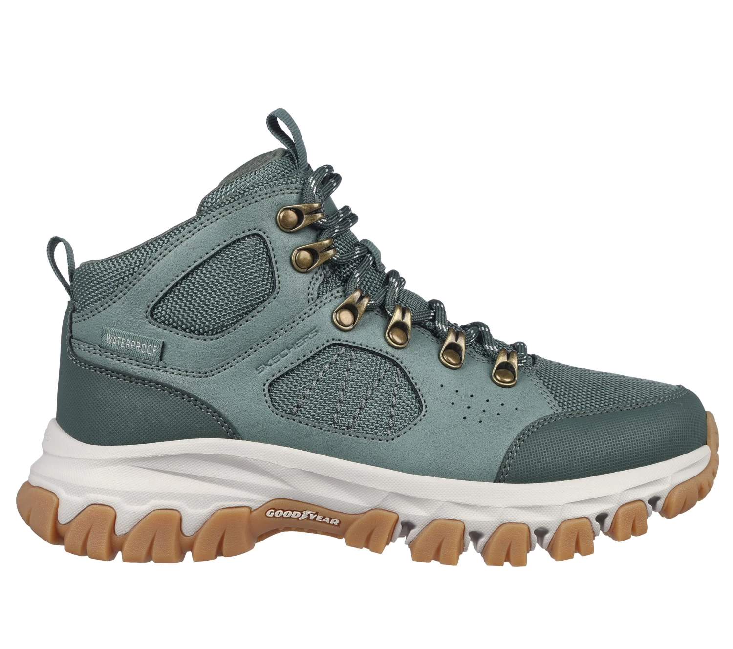 Explore the trails in rugged comfort with Skechers Relaxed Fit®: Edgmont. This lace-up outdoor trail design features a waterproof leather, mesh and synthetic upper with a Skechers Air-Cooled Memory Foam® insole and a durable Goodyear® Rubber Outsole.