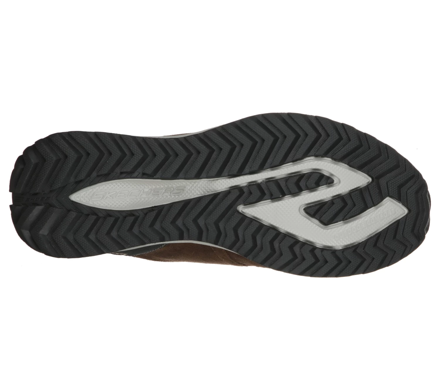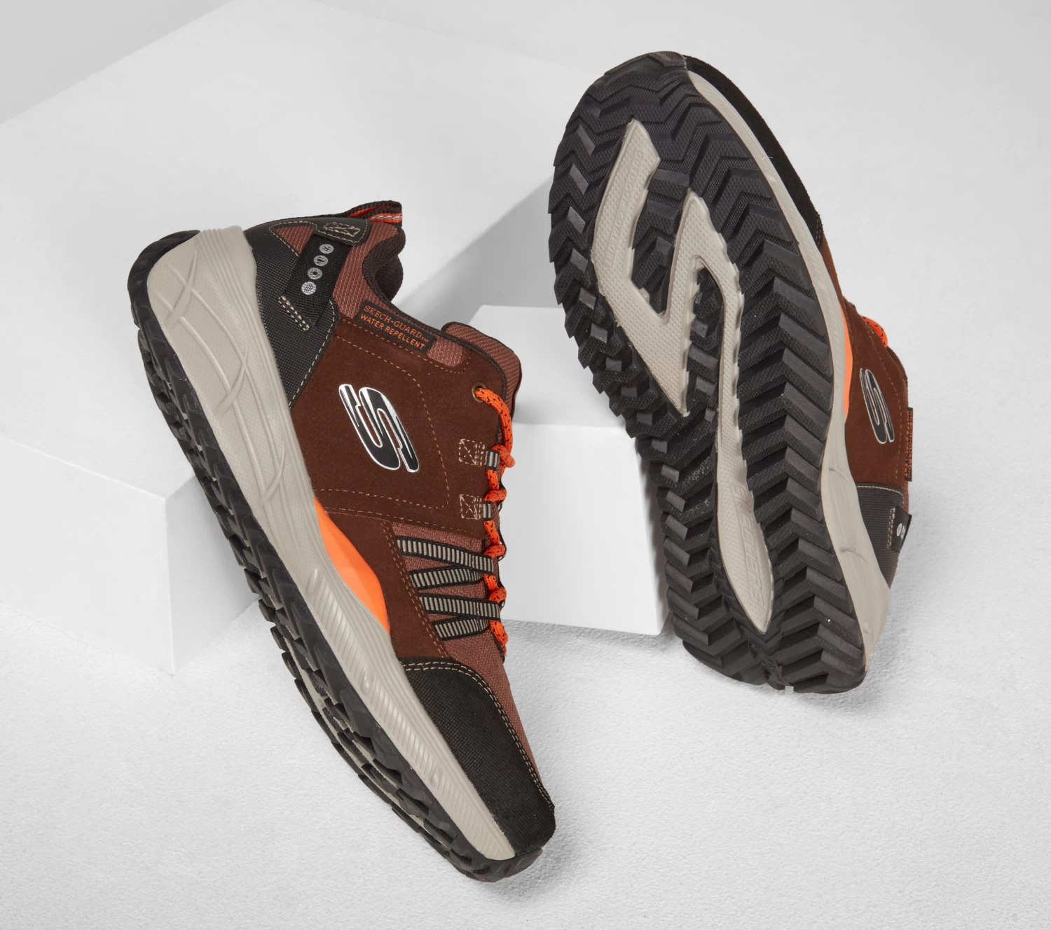 Make tracks on more terrain in rugged durability and cushioned comfort with Skechers Relaxed Fit®: Equalizer 4.0 Trail. This lace-up outdoor trail walking style features a water-repellent leather, synthetic and mesh upper with an Air-Cooled Memory Foam® insole.
