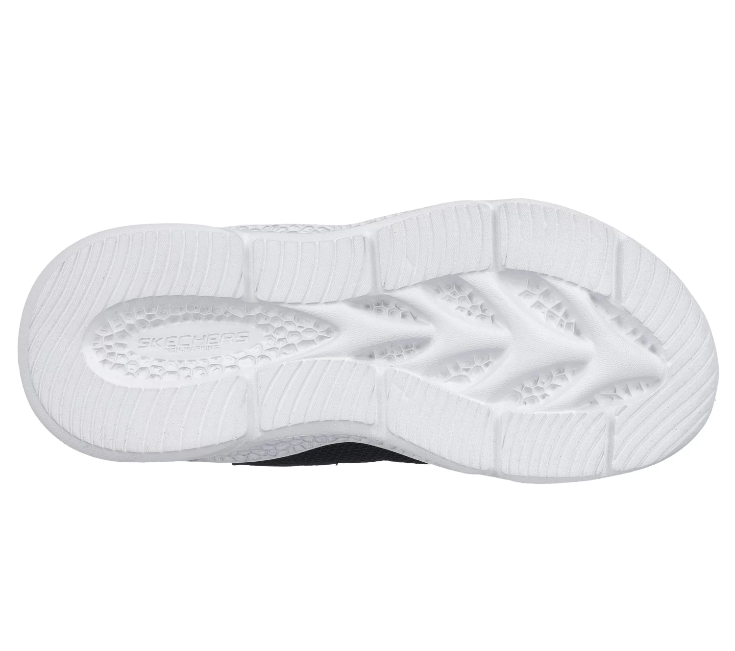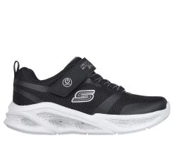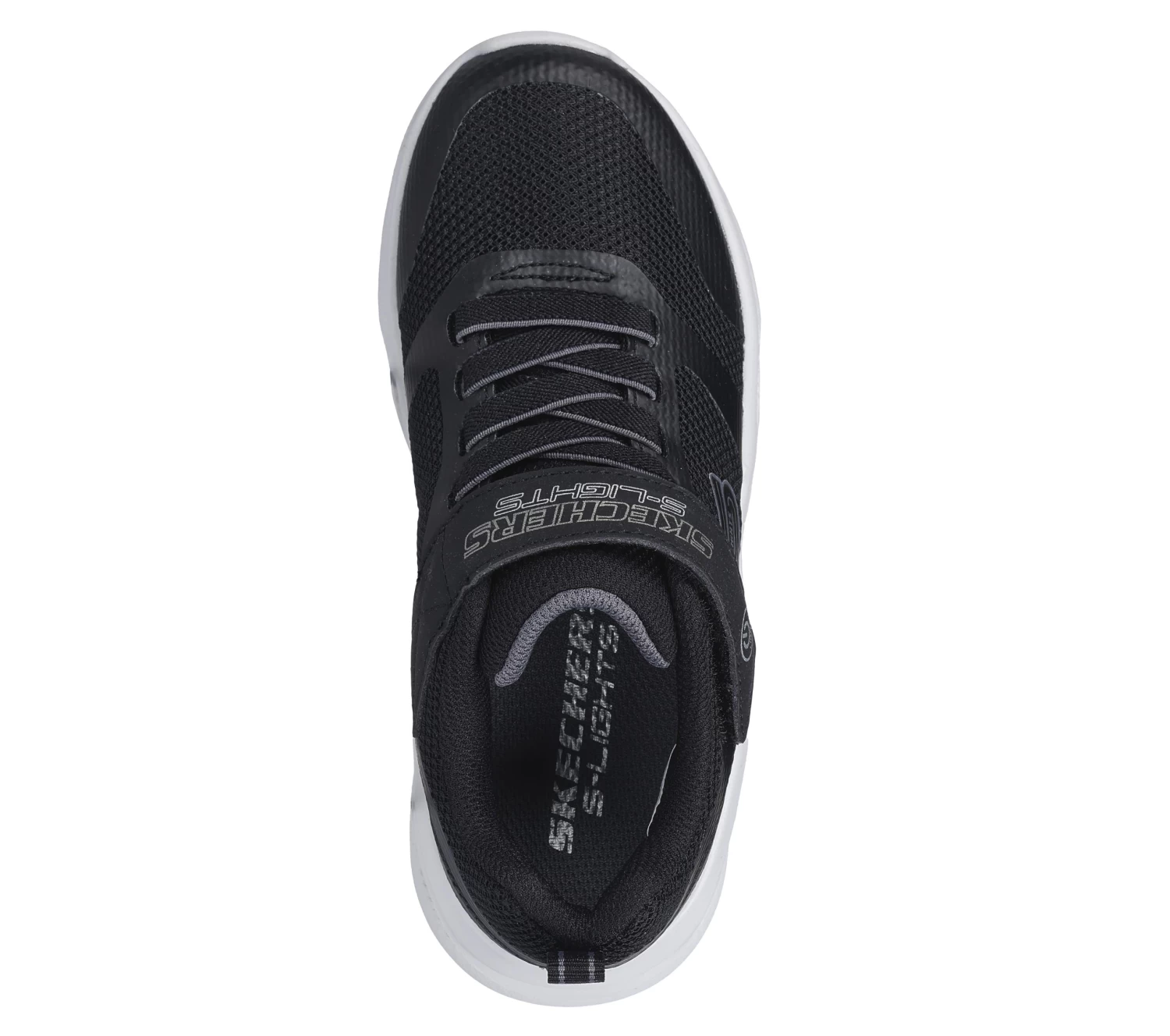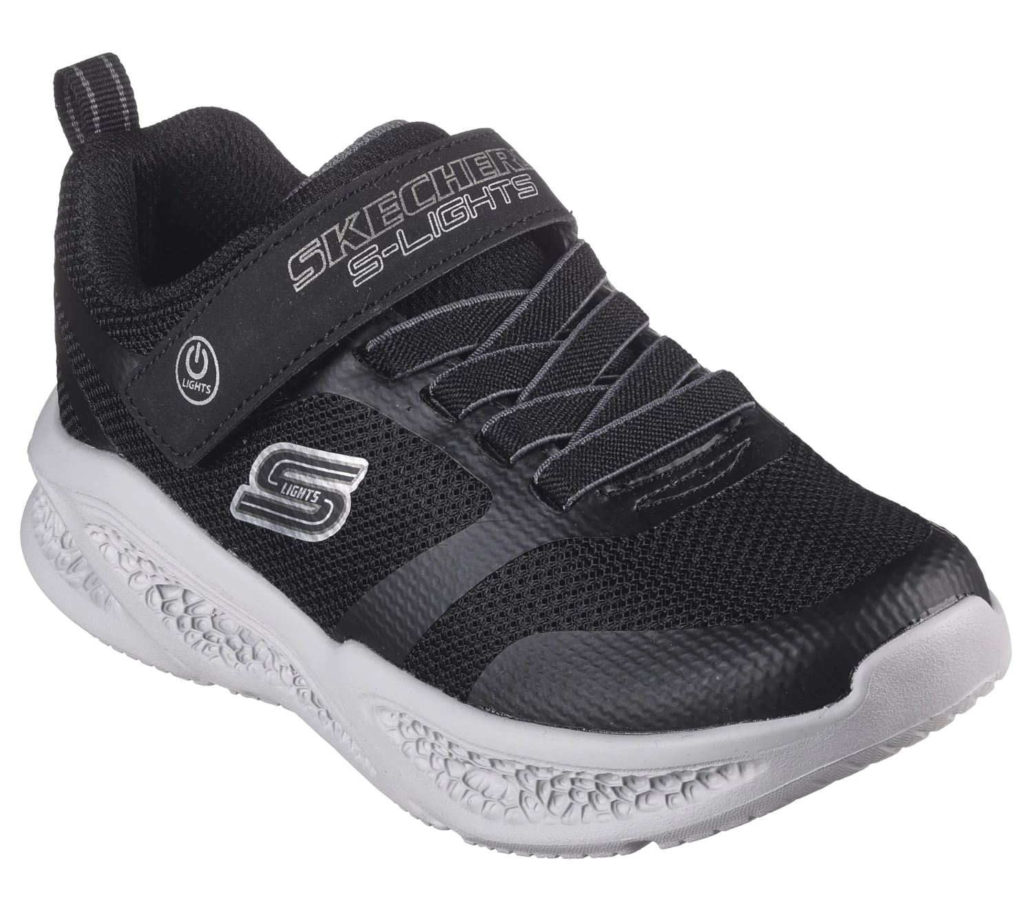 Illuminate your steps in sporty style and comfort with Skechers S-Lights®: Meteor-Lights. This stretch-laced design has a mesh and synthetic upper, plus a fun light-up midsole.