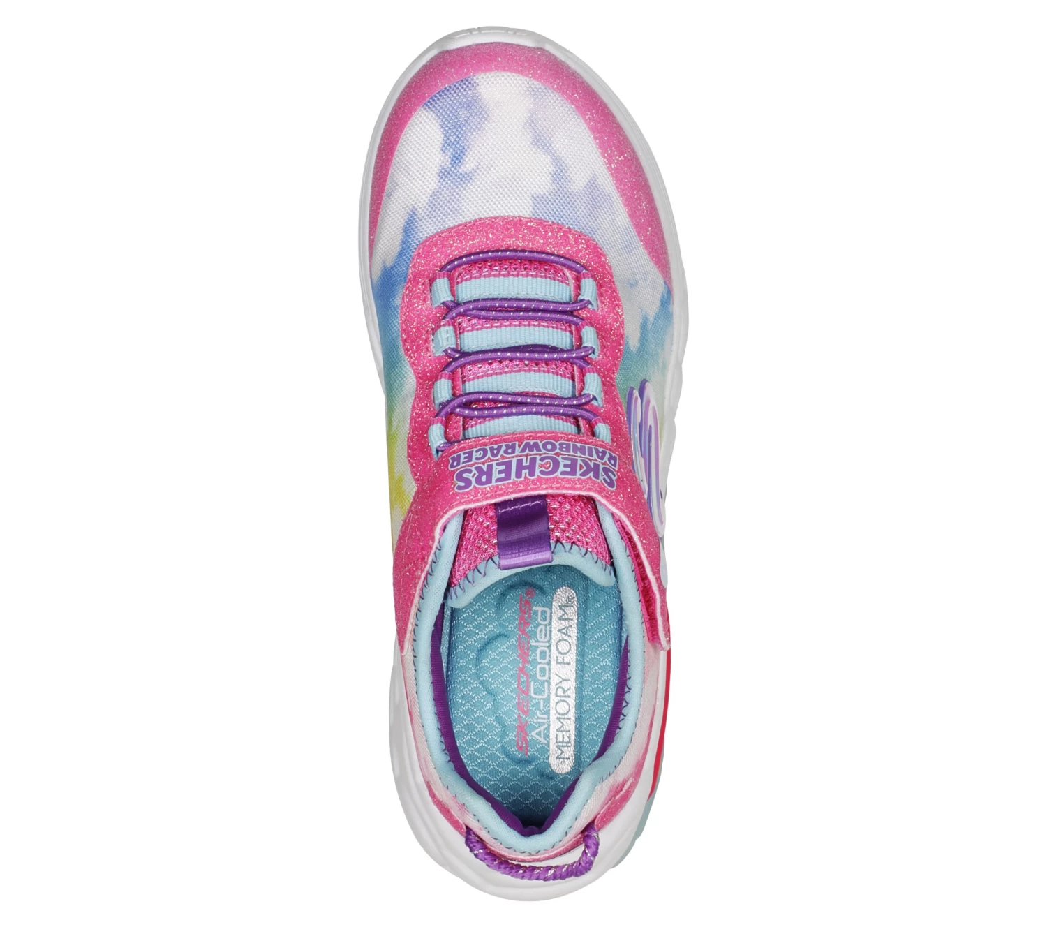 Brighten up the day in fun sporty style with the Skechers Rainbow Racer Lights™. This casual lightweight pull-on sneaker features a breathable athletic mesh and smooth synthetic upper with a fun rainbow cloud sculpted light-up midsole.
