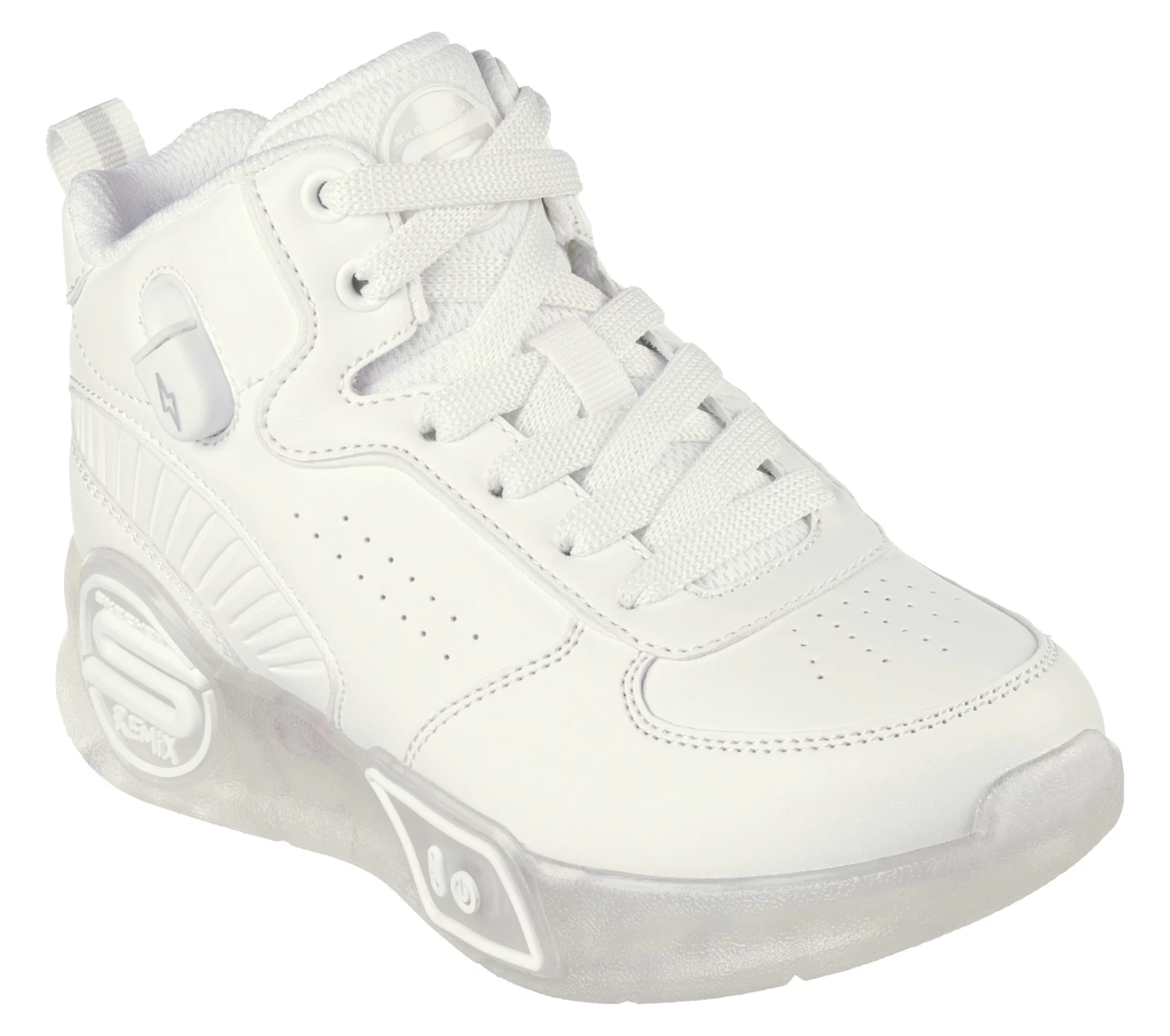 Feel the rhythm and see it too, wearing Skechers S-Lights® Remix. This lace-up, rechargeable high-top design features a smooth synthetic upper with a USB port, a sound-activated light-up midsole with an on/off button, plus a cushioned comfort insole.
