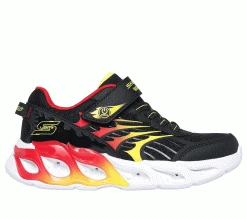 Blaze through the day with fiery light-up fun wearing Skechers S-Lights®: Thermo-Flash 2.0. This fire-themed light-up design features an athletic mesh and synthetic upper with stretch laces, an adjustable instep strap, and a well-cushioned midsole with light-up “flames” tech piece.