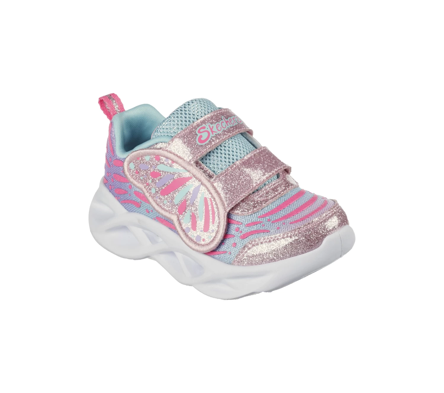 Dazzle your steps in style and comfort with Skechers S-Lights: Twisty Brights – Wingin’ It. This casual lightweight slip-on features a mesh and glitter synthetic upper with butterfly wing instep strap, plus a light-up midsole.
