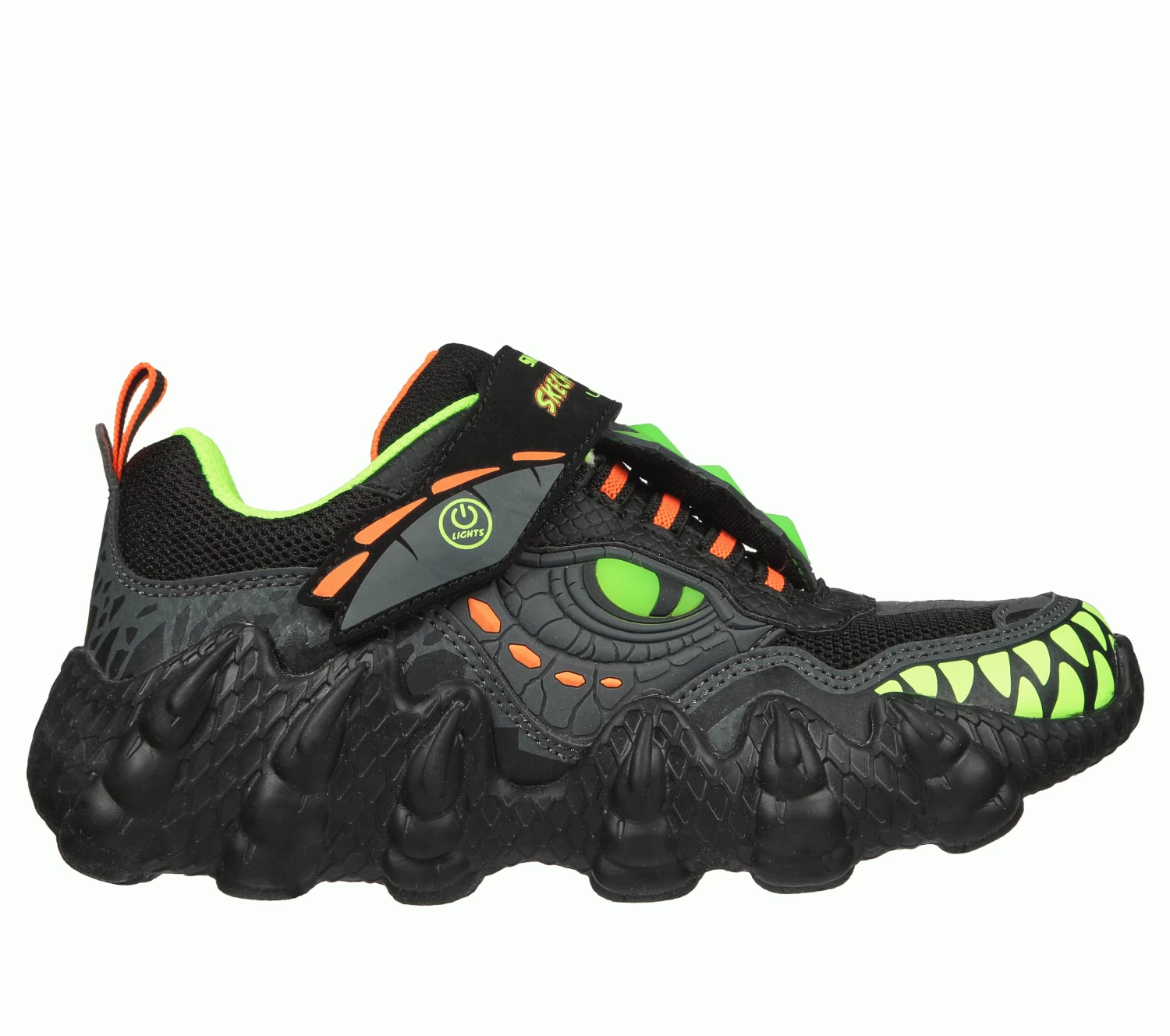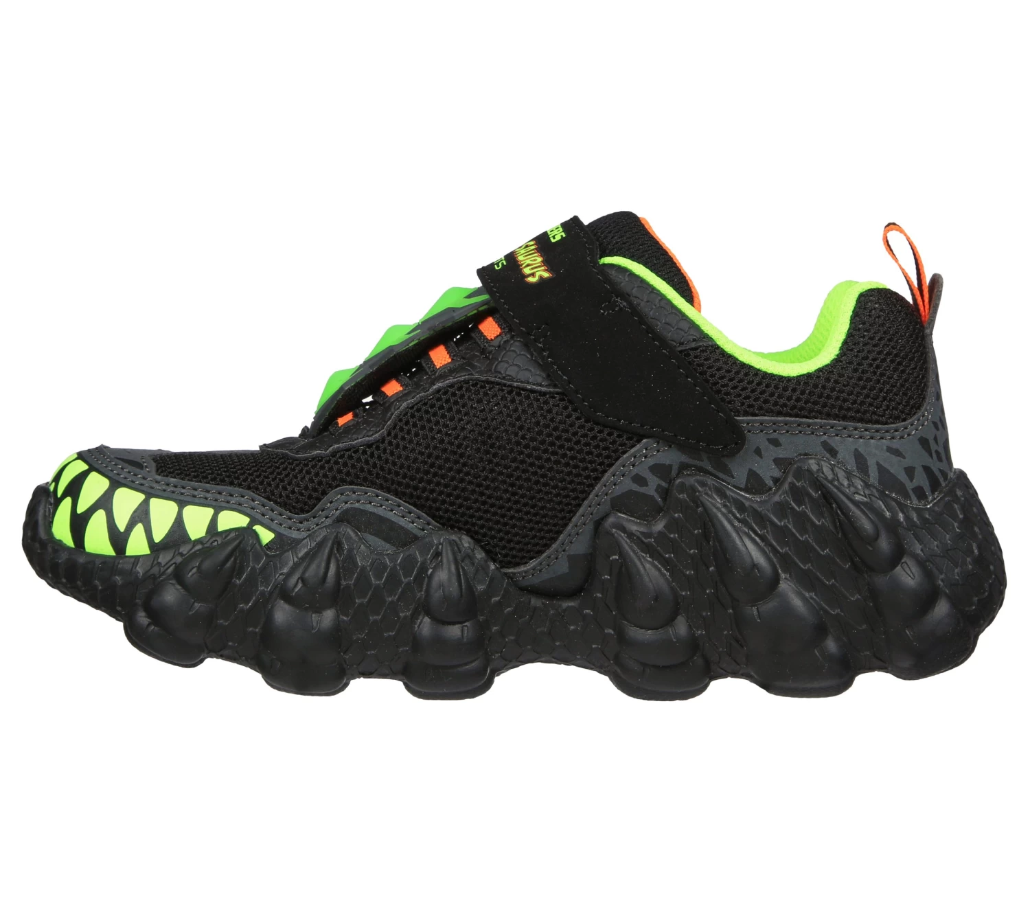 Stomp in roar-some style and comfort with Skechers Skech-O-SauruS-Lights – Dino-Tracker. This light-up dinosaur theme design features a synthetic and woven fabric upper in a slip-on style with a hook and loop closure.