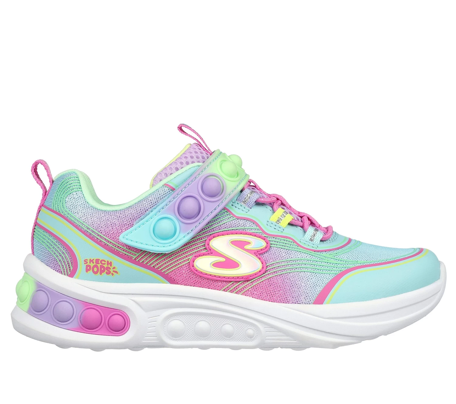 Poppable fun combines with awesome comfort in the Skechers Skech Pops Blast. This pop bubble themed sneaker features mesh and synthetic upper with stretch laces and a cushioned insole.