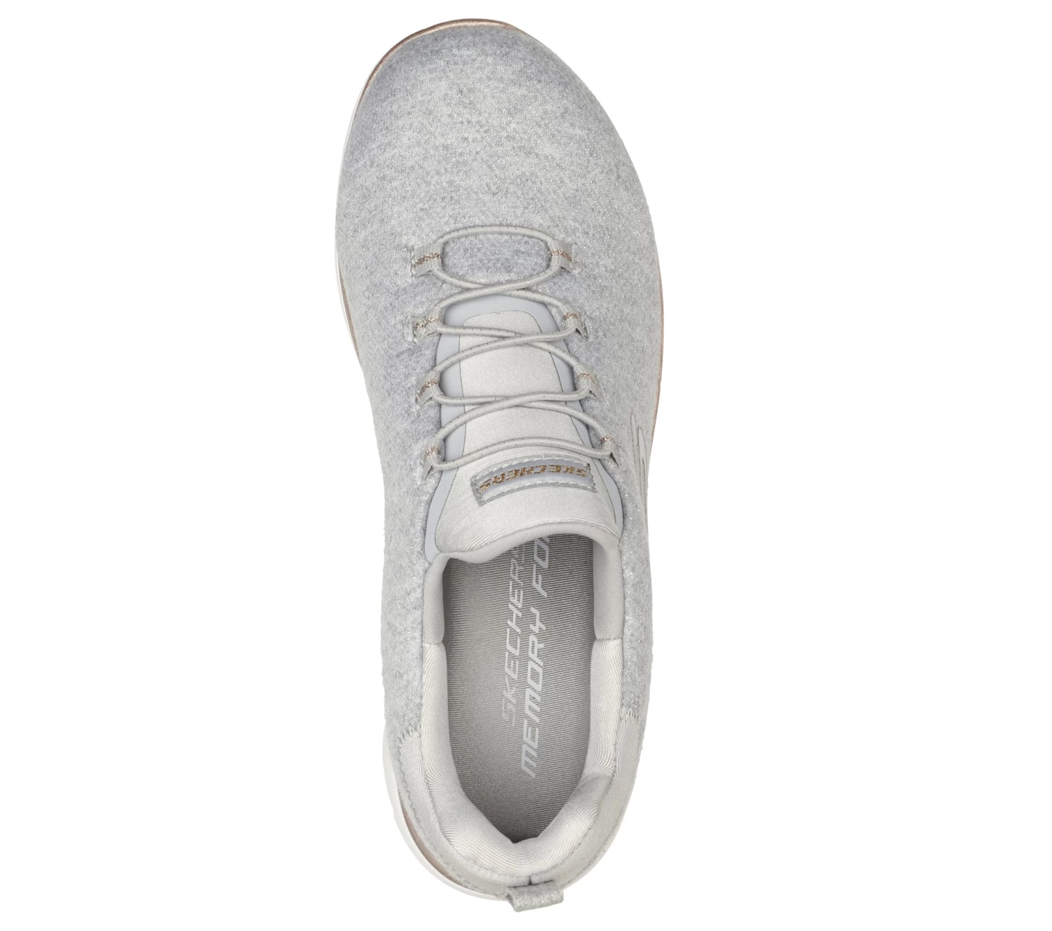 Add some shimmer and amazing comfort to your look with Skechers Summits – Dazzling Me. Featuring a woven herringbone upper with metallic detail with stretch laces and a cushioned Skechers Memory Foam™ insole.