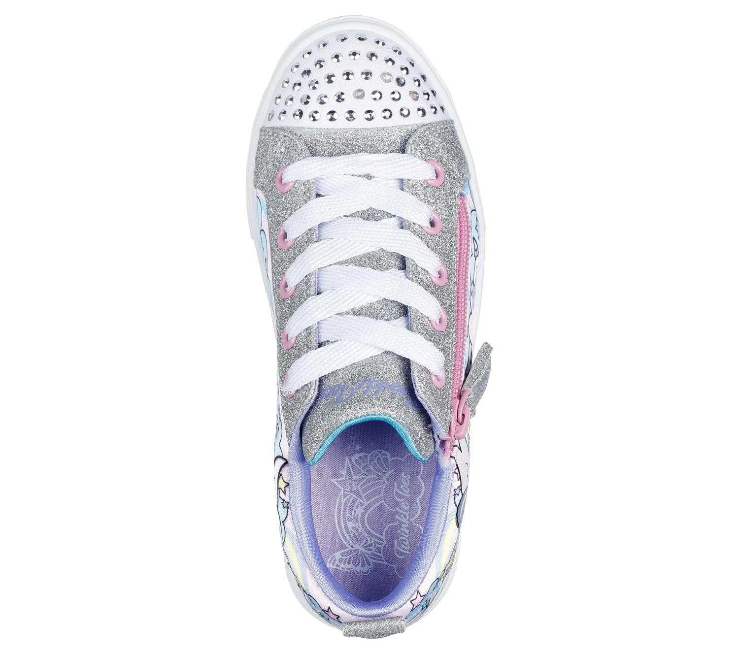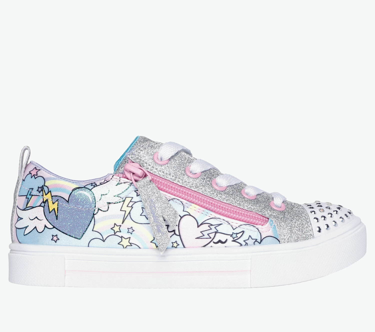 Light up your steps with heart filled style in Skechers Twinkle Toes®: Twinkle Sparks – Flying Hearts. This fun light-up sneaker features a rainbow heart print fabric upper with glitter trim, lace-up front, lateral side zip closure, and a light-up rhinestud embellished toe.