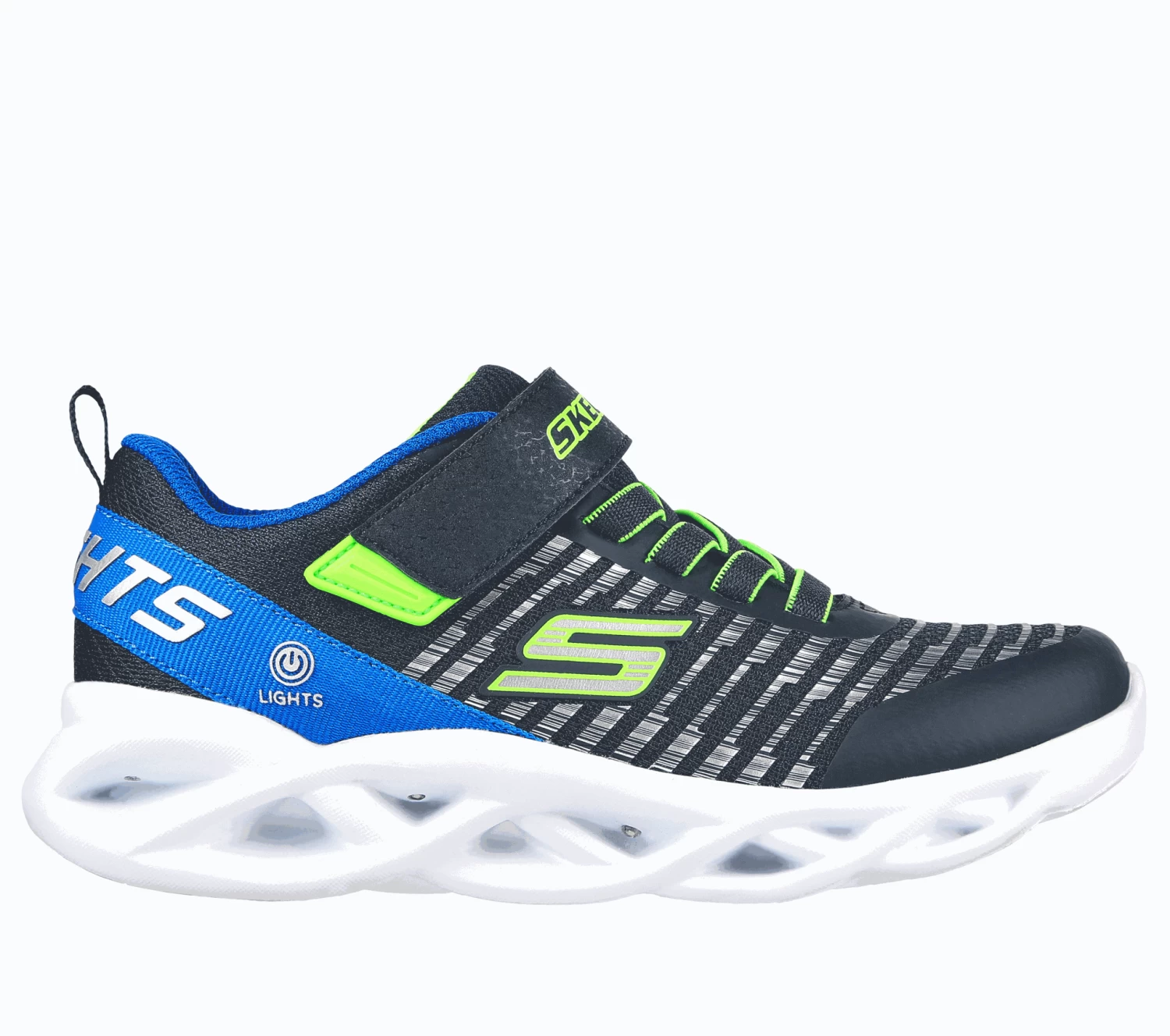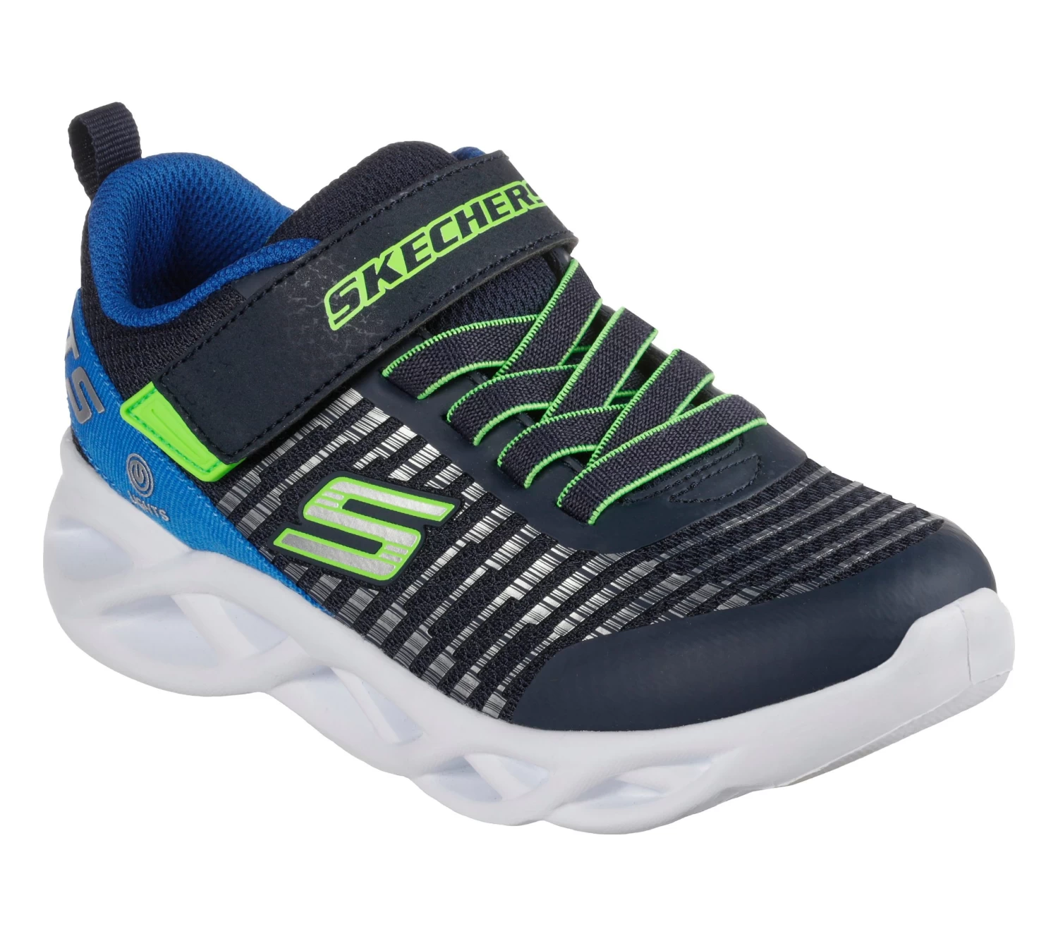 Light-up the fun with Skechers Twisty Brights – Novlo. This slip-on features a mesh and synthetic upper with stretch laces and shock-absorbing light-up midsole
