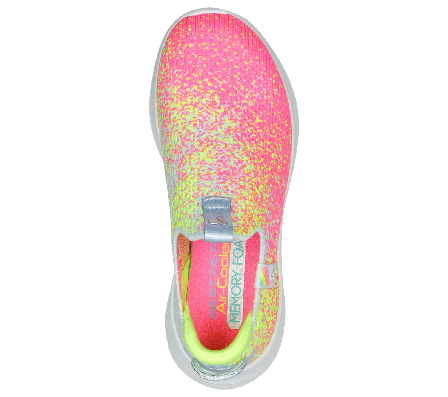 Move with colorful style and comfort in Skechers Ultra Flex 3.0 – Splendid Spots. This Stretch Fit® design features an ombre speckled Skech-Knit upper with a cushioned Skechers Air-Cooled Memory Foam® insole.