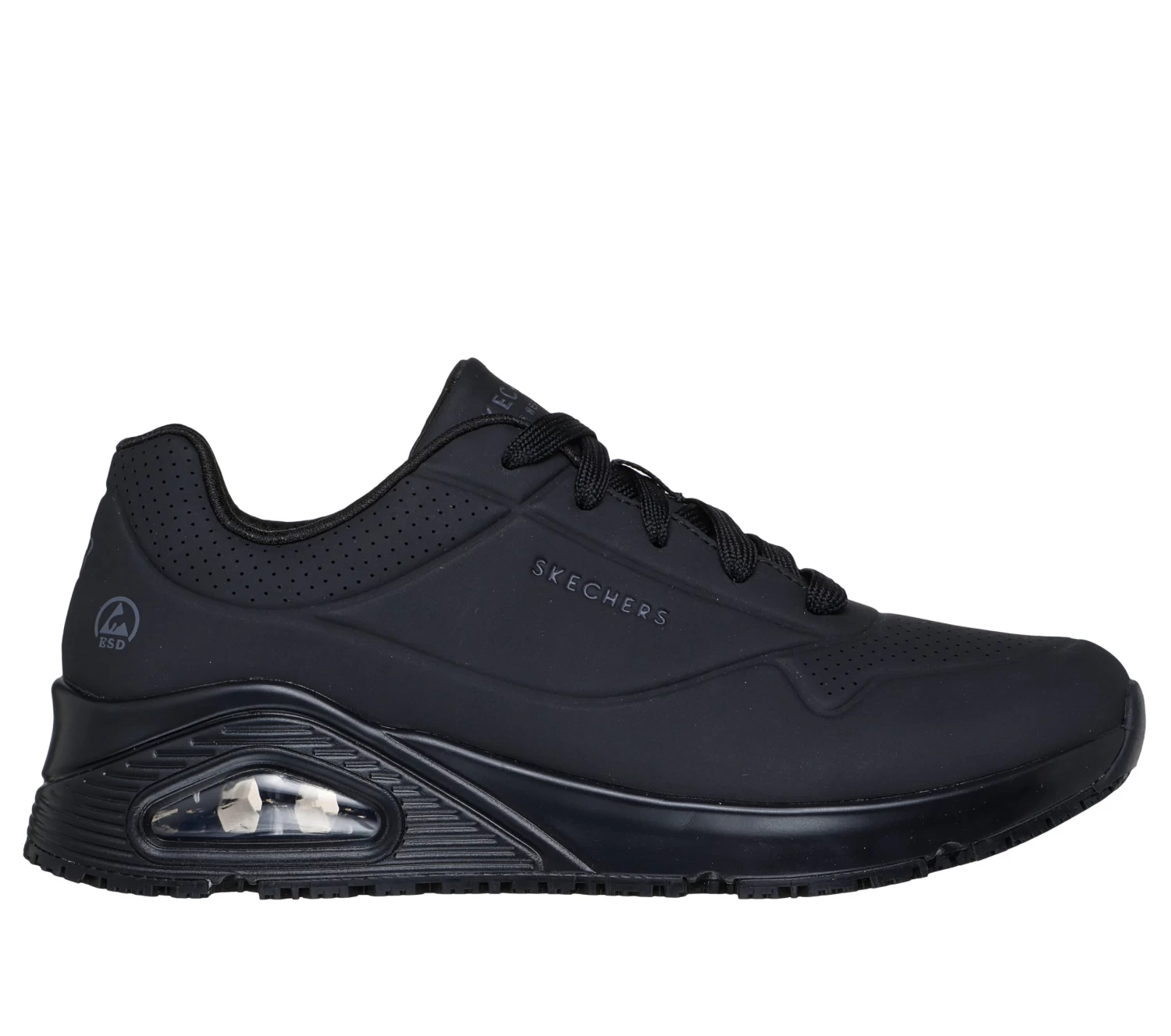 A favorite style arrives in comfort and safety with Skechers Work: Uno SR. This slip-resistant work design features a durable perforated synthetic durabuck upper with a Skechers Air-Cooled Memory Foam® insole and Skech-Air® visible airbag midsole.